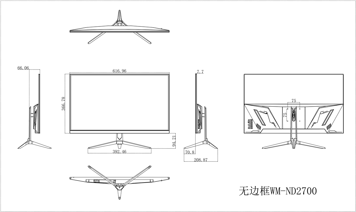 監(jiān)視器尺寸:616.96mm(W)×367.03mm(H)×7.7mm(D)不含底座